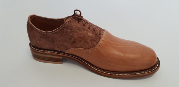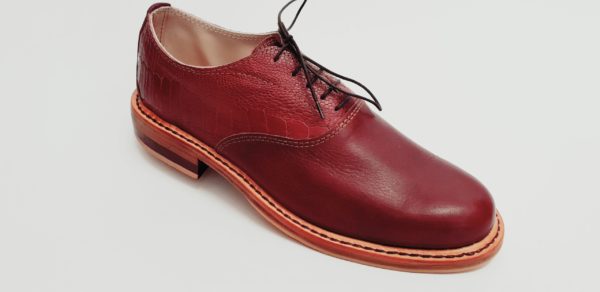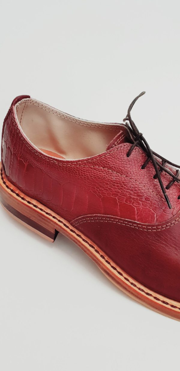 La scarpa in questione e’ stata realizzata su richiesta del cliente. E’ un pezzo unico e in questo caso e’ stata utilizzata pelle di zampa di struzzo e vitello. IL modello e’ una francesina con cucitura a doppio giro (realizzata con spago cerato e ritorto a mano a 8 capi), chiamato “GOODYEAR”. Il primo giro e’ interno e non si vede, l’ altro cuce il guardolo sulla suola. Quest’ultimo, su richiesta del cliente, ha un colore vinaccia.