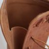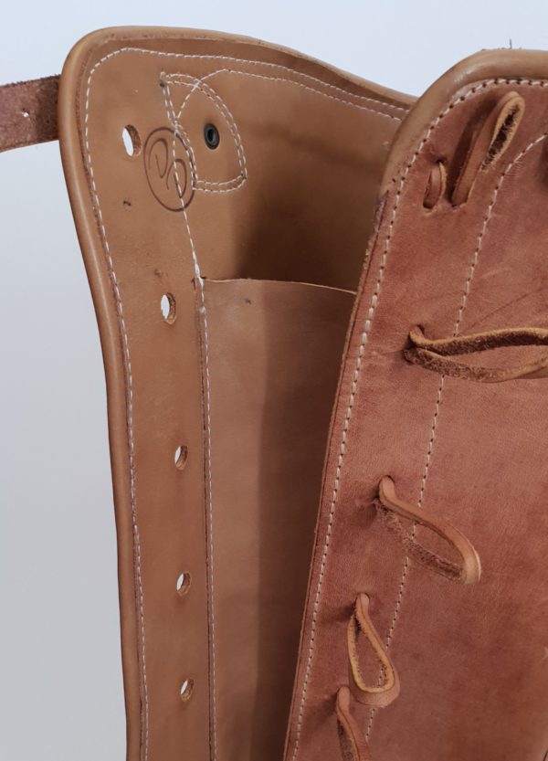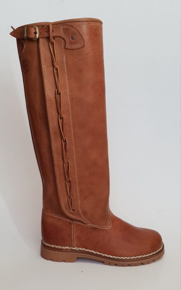 Foderato in vitello sia nel piede, che nel gambale, ha un soffietto interno, che impedisce intrusioni di liquidi fino quasi all’ intera altezza del gambale. E’ completamente realizzato a mano. La realizzazione di questo modello e’ identificabile in 4 tipologie di cuciture a mano: al “NORVEGESE” (in questo caso, visto il grosso volume del filo, si applica un carrarmato o una “gumlite”.. in foto) “NORVEGESE AL TIROLESE”, “NORVEGESE AL TIROLESE A TRECCIA” (per questa tecnica di solito uso uno spessore da 1,4 mm. e aggiungo un guardolo sotto le cuciture. In questo caso, la suola puo’ essere lasciata in cuoio o possiamo applicare una mezza suola antiscivolo in gomma) e “GOODYEAR”. La cucitura in foto (norvegese) e’ la piu’ semplice e piu’ veloce delle altre (ma comunque 2 ore per cucire un giro suola). Il filo e’ in cotone a 10 capi, cerato e ritorto a mano. Lo stivale e’ realizzabile anche a tubo, intero, senza alcuna allacciatura. Su richiesta del cliente, e’ possibile farlo in tutte le altezze.